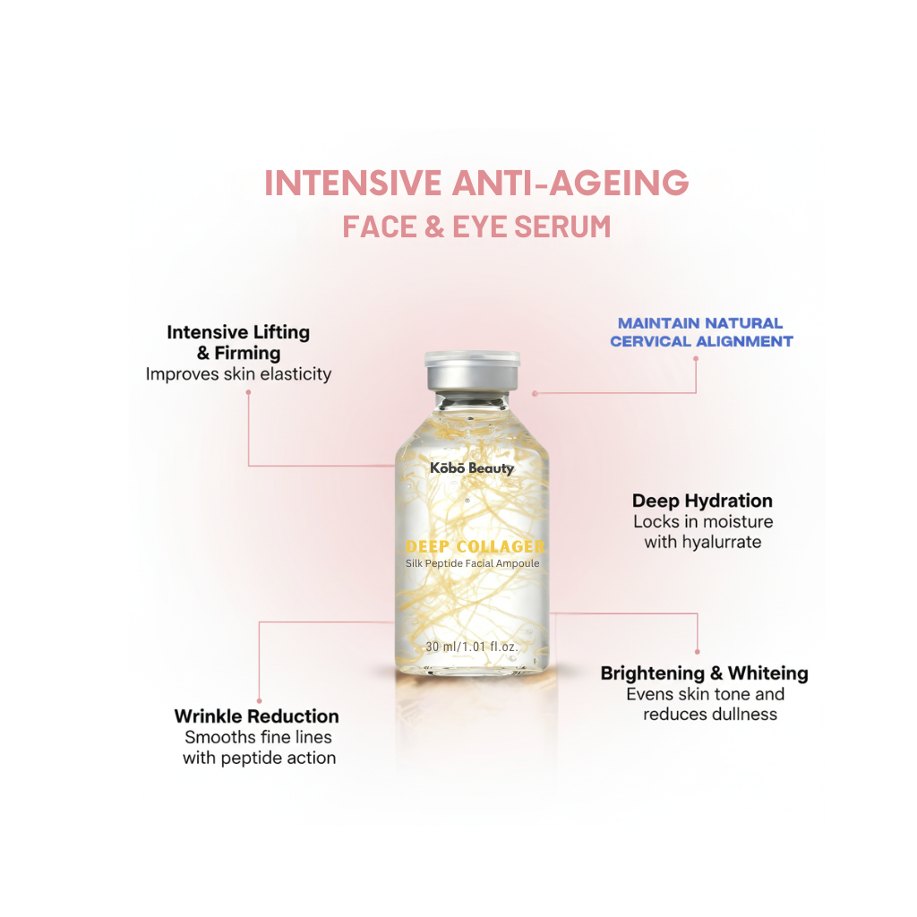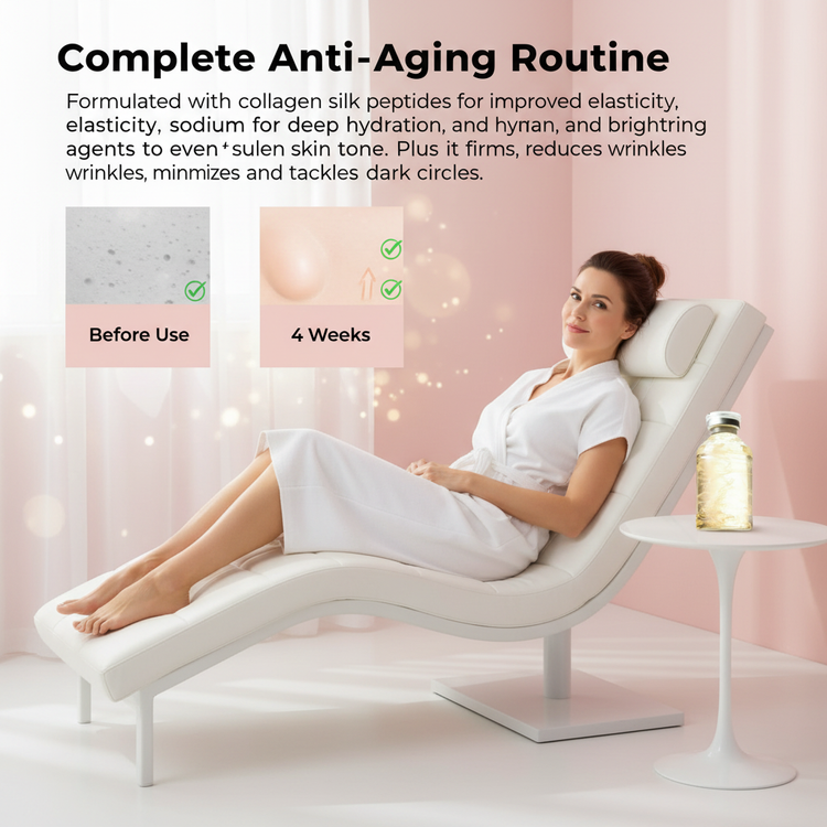 Formulated with collagen silk peptides for improved elasticity, sodium hyaluronate for deep hydration, and brightening agents to even skin tone. Plus, it firms, reduces wrinkles, minimizes pores, and tackles dark circles for a complete anti-aging routine.